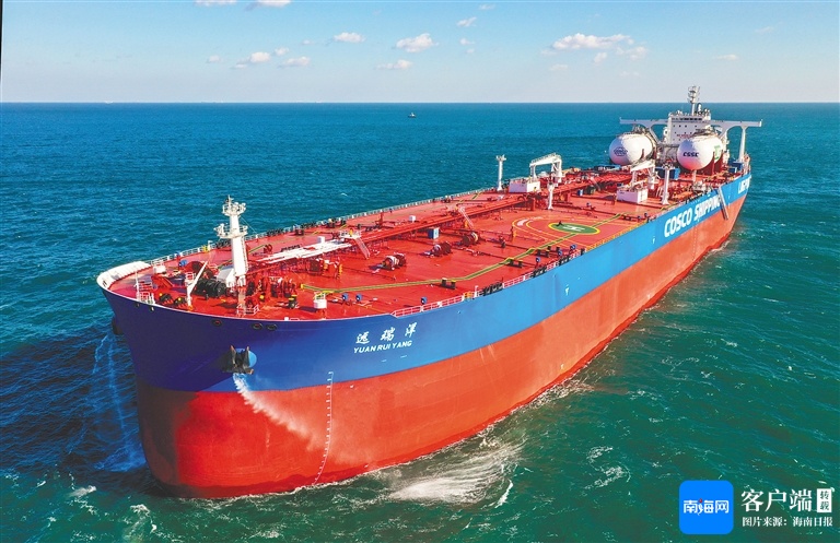 2022年2月28日上午,全球首艘LNG双燃料超大型原油轮“远瑞洋”轮入籍“中国洋浦港”。图为“远瑞洋”轮。中远海运能源运输股份有限公司供图