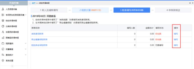 【1收入及减除填写】中如果填写了“减免税额”、“商业健康保险”或“税延养老保险”,需要在【3附表填写】中完善附表信息。