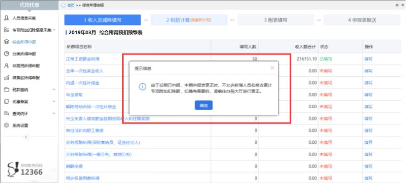 点击【1收入及减除填写】,系统提示往期错误更正,不能新增人员和修改累计专项附加扣除额。