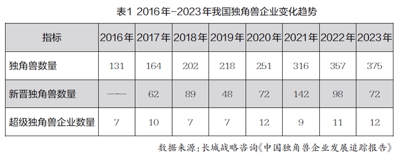 根据长城战略咨询发布的《中国独角兽企业发展追踪报告》显示,中国独角兽企业数量从2016年的131家增长到2023年的375家,八年间增长近2倍。其中,新晋独角兽企业数量虽然有所波动,但总体呈上升态势,超级独角兽企业每年总数保持10家左右。(见表1)