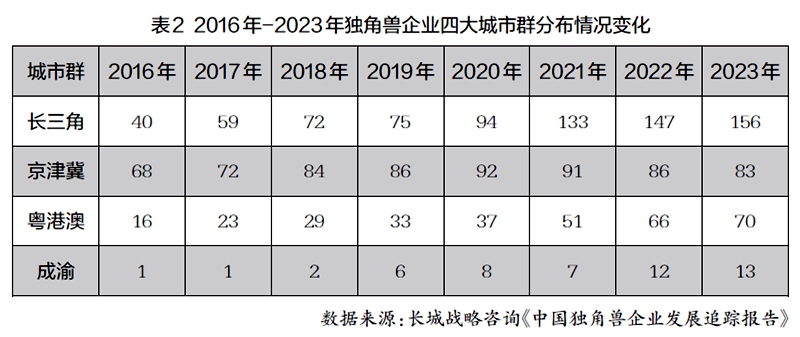 2016年至2023年,独角兽企业分布的城市从16个增加至56个,八年间累计22个省份出现过独角兽企业,其中北京、上海、杭州、广州、深圳五大城市聚集了我国主要的独角兽企业,独角兽企业呈现“高集聚、广分布”的特征,在城市分布上进一步扩容,集聚度呈下降态势。北京、上海新媒体、人工智能等行业全面领先,广州、深圳电商、物流成为新引擎。整体上看,独角兽企业基于城市区位优势,正在构建全新的城市优势产业。从城市群分布来看,2023年长三角、京津冀、粤港澳大湾区以及成渝四个城市群独角兽企业累计占到全国独角兽企业的九成左右,尤其是长三角独角兽企业增加迅速,2020年以后开始超过京津冀城市群独角兽企业数目领先全国。(见表2)