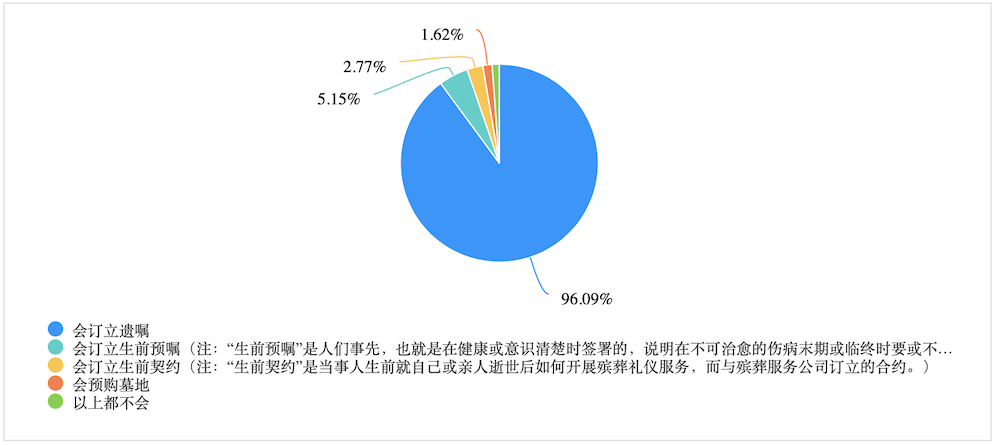 但是被问及生前事业时,大部分人都不太了解,也不太会去涉及,比如大家相对比较熟悉的是遗嘱,有96.09%的受访者表示会考虑订立遗嘱;但只有5.15%的受访者表示会订立生前预嘱,即人们在健康或意识清楚时签署的,说明在不可治愈的伤病末期或临终时要或不要哪种医疗护理的指示文件;2.77%的受访者表示会订立生前契约,即当事人生前就自己或亲人逝世后如何开展殡葬礼仪服务,而与殡葬服务公司订立的合约。