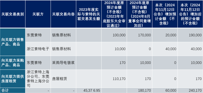 去年年底,帝科股份股东大会审议通过2024年与索特关联交易金额不超过11.017亿元。其中,10亿元是向索特销售原料(银粉),1亿元是向索特采购产品,170万元是向索特出租房屋。