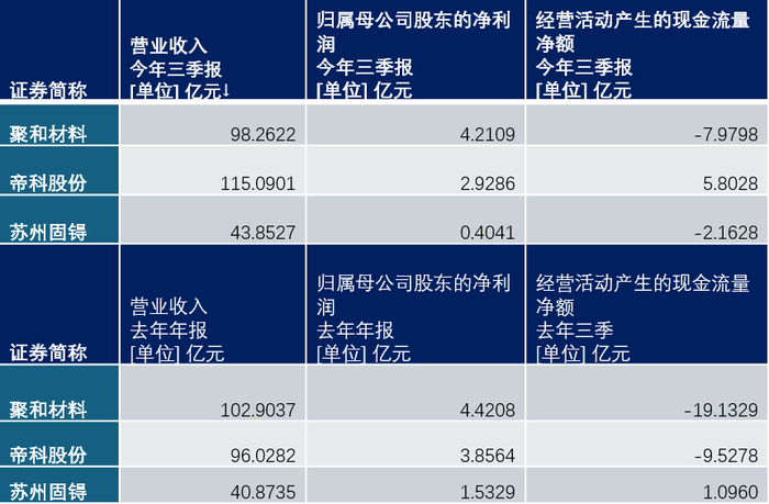 今年前三季度,帝科股份以115亿的营收赚了2.9亿元,而聚和以98亿的营收赚了2.9亿元。