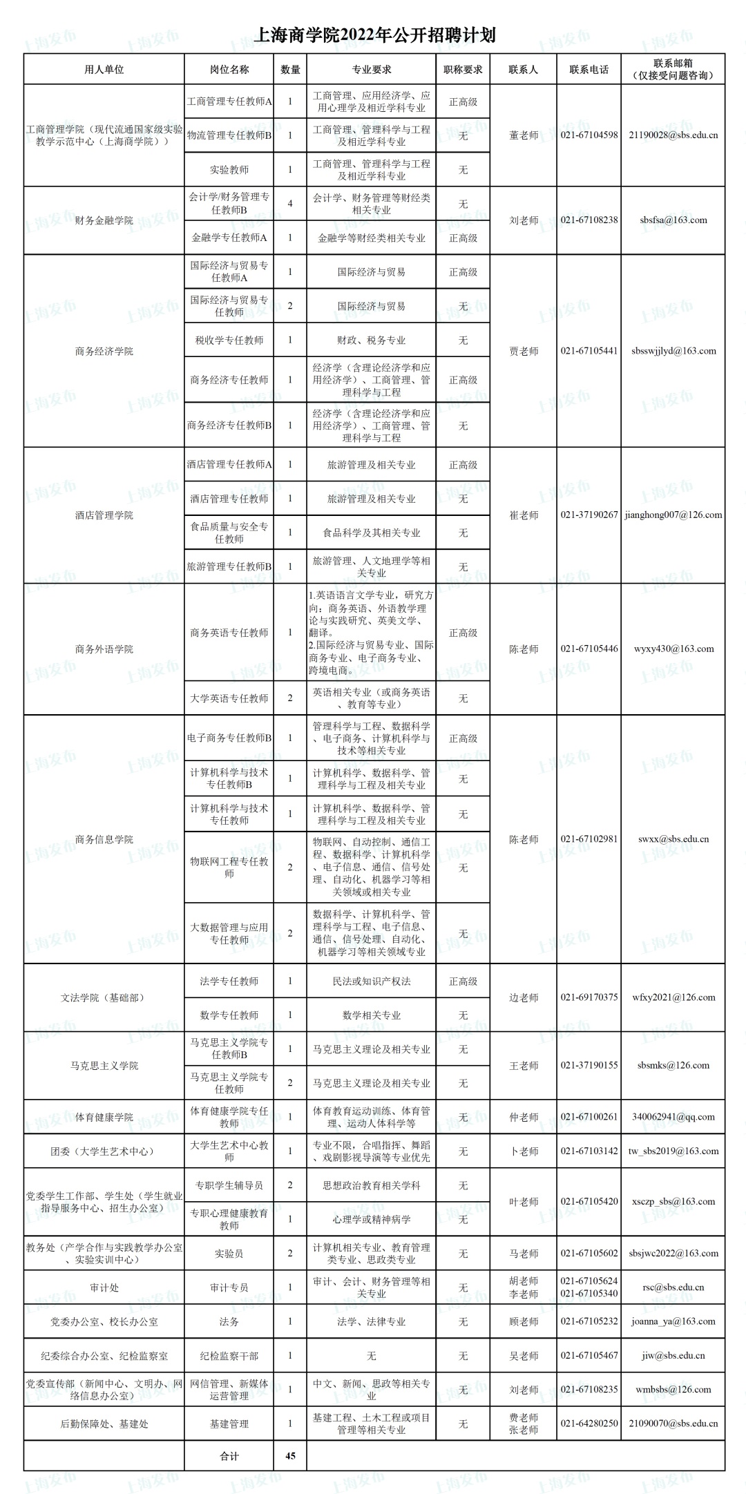 市人社局表示,上海商学院拟公开招聘专任教师34名、专职学生辅导员2名、专职心理健康教育教师1名、大学生艺术中心教师1名、其他专业技术岗位人员3名、综合管理岗位人员4名,共计45名。有意者请于3月11日前登录https://zhaopin.sbs.edu.cn/zp.html#/进行应聘。详见↓