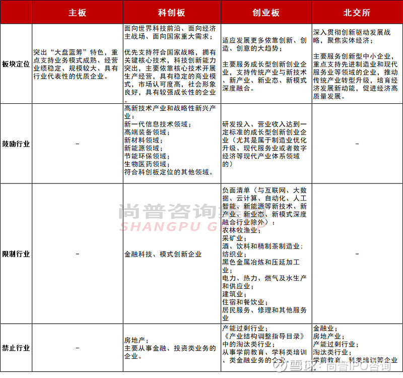 各板块定位及行业要求这次全面注册制改革统一了各市场板块注册制安排,将四大板块的市场定位清晰呈现,使得不同规模、不同行业以及处于不同发展阶段的优质企业,选择合适的发行上市板块,提升资本市场多样性。