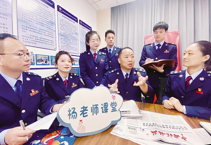国家税务总局西安市税务局倡导税务干部读报学报用报,把《中国税务报》作为推动干部思想政治教育、业务学习和服务纳税人缴费人的重要抓手。该市税务干部杨旭(右三)十年如一日坚持阅读《中国税务报》,整理出60余万字的学习笔记,被同事和纳税人缴费人称为“杨百度”。图为近日杨旭和他领衔的政策辅导团队“杨老师课堂”的成员在研读报纸。