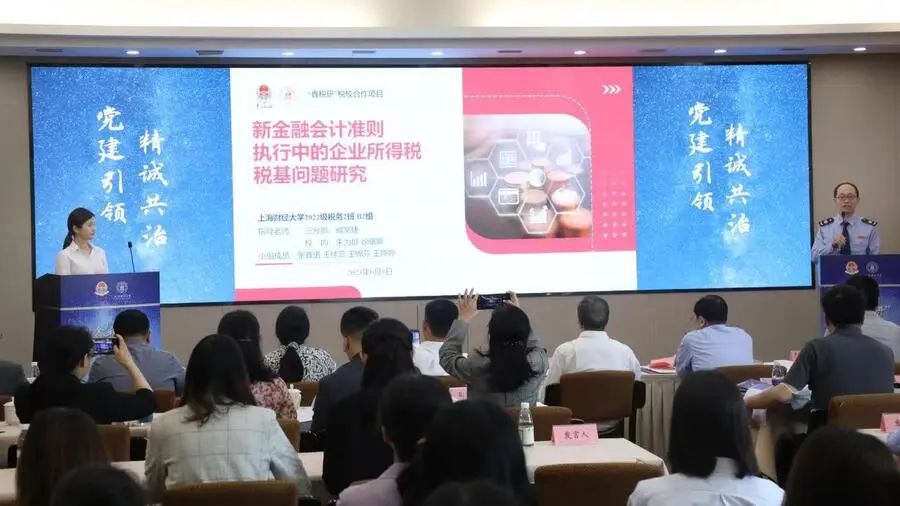 2023年春季学期,上海财经大学公共经济与管理学院开设了一门别开生面的税务必修课,近日刚刚结课。在过去的5个月中,来自国家税务总局上海市税务局第三税务分局各科室的科长们为这门课担任校外指导老师,与上海财经大学22级税务研究生们同上一堂课、共研一个题,一起深入金融企业展开调研。