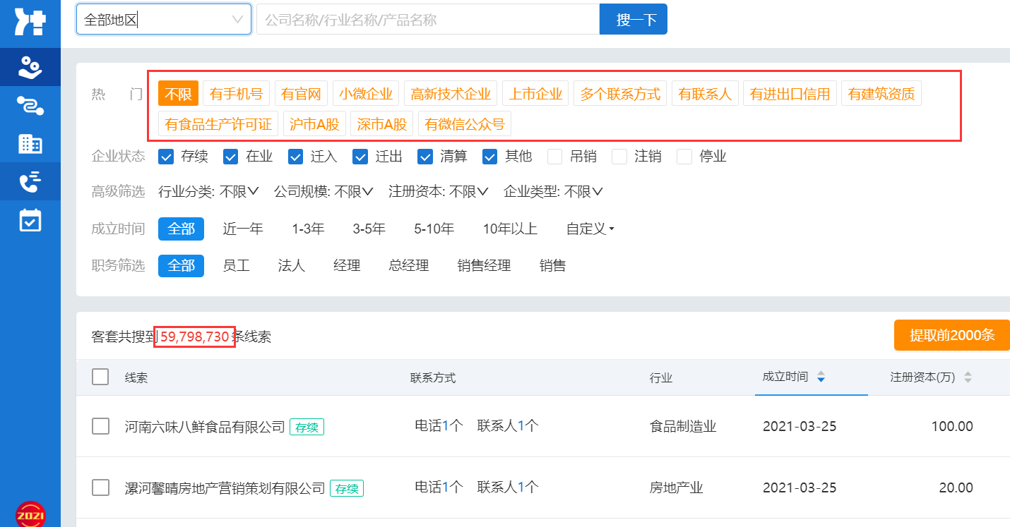 目前客套企业名录搜索软件注册可免费提取1000条信息,点击客套注册提取。
