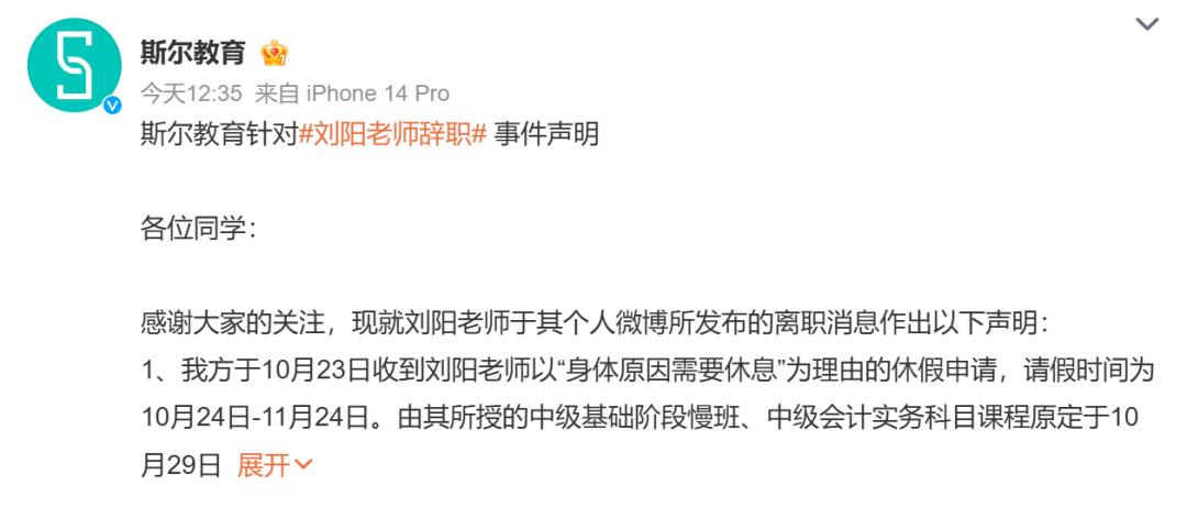 当天中午,@斯尔教育 发布声明回应“刘阳老师辞职一事”称,刘阳老师通过邮件单方面提出离职。