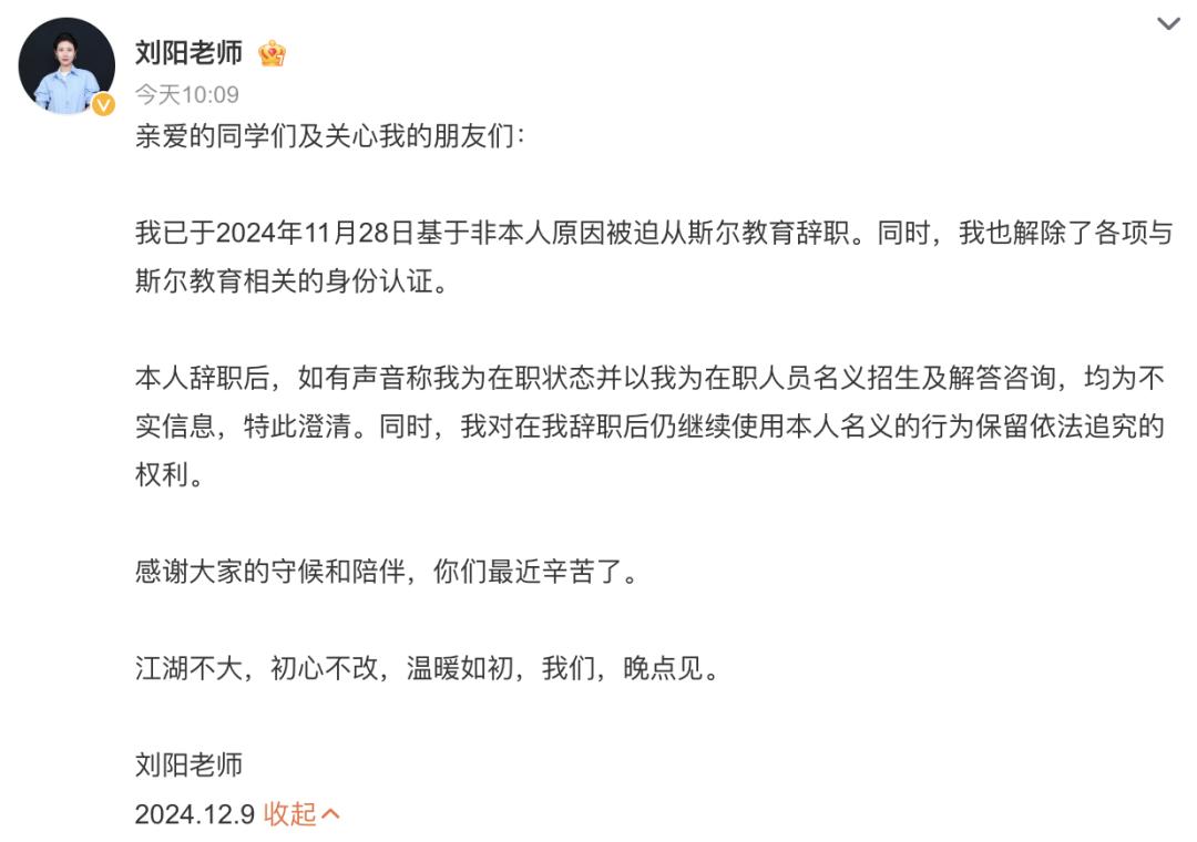 “我已于2024年11月28日基于非本人原因被迫从斯尔教育辞职。同时,我也解除了各项与斯尔教育相关的身份认证。本人辞职后,如有声音称我为在职状态并以我为在职人员名义招生及解答咨询,均为不实信息,特此澄清。”
