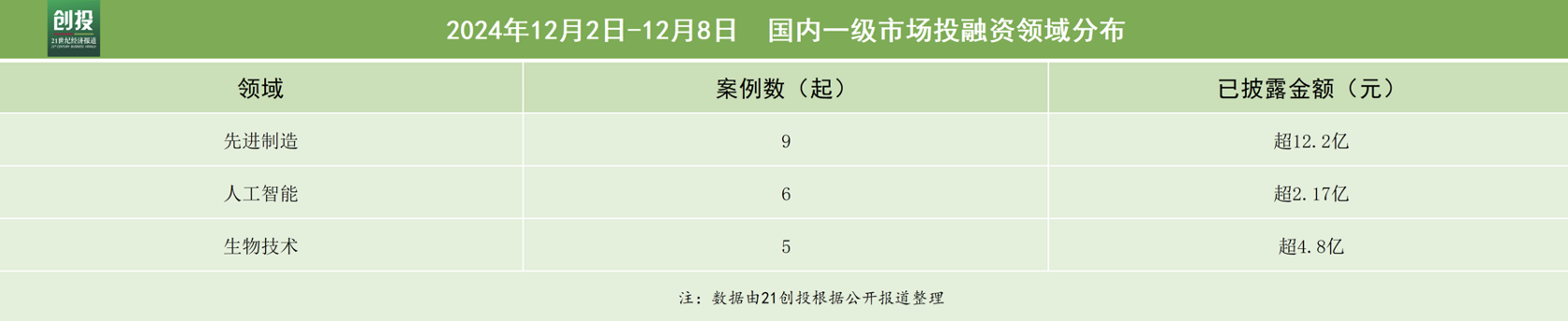 本周融资数量最多的行业领域仍是科技与制造。在三大行业领域的诸多赛道中,先进制造赛道完成9笔融资,融资金额超12.2亿元人民币;人工智能赛道完成6笔融资,披露的融资额约为2.17亿元人民币;生物技术赛道完成5笔融资,融资金额超4.8亿元人民币。