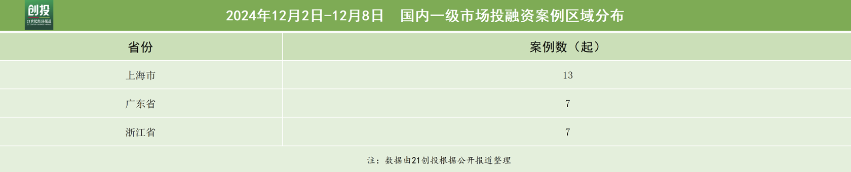 从披露获投企业的地域分布来看,本周的融资地区主要集中在上海市、广东省、浙江省,分别完成13笔、7笔、7笔融资。
