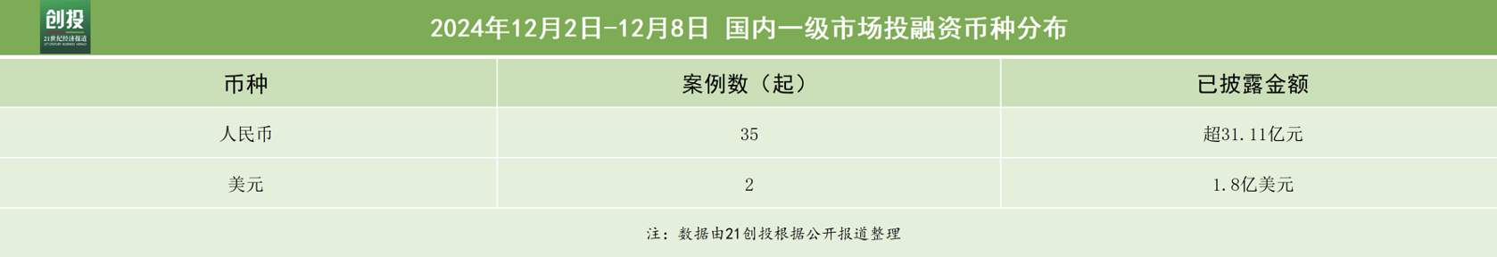 21创投不完全统计,12月2日—12月8日,报告日期内国内一级市场发生融资事件46起。其中,有37笔融资披露了融资金额和币种信息,总规模约合人民币44.18亿元。