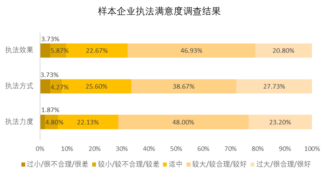 执法上,约七成企业认为执法的效果、方式和力度是合理的。69.6%的企业“很满意”或“满意”现行的执法标准,67.73%“很满意”或“满意”执法效果,66.4%“很满意”或“满意”执法方式。