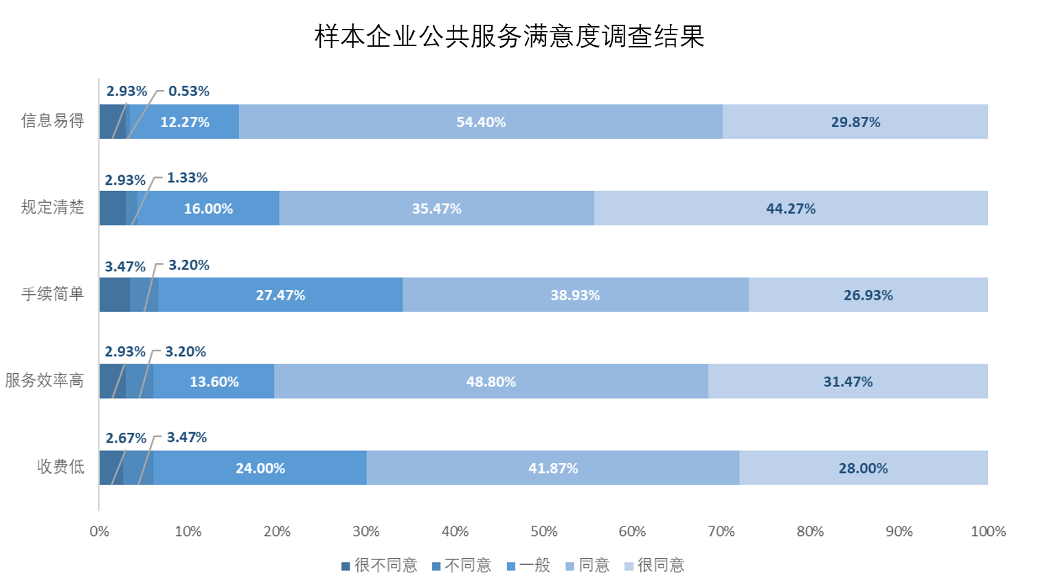 调研过程中,不少企业向课题组反映希望简化审批流程、明确审批标准等。在公共服务板块的五个维度中(信息易得、规定清楚、手续简单、服务效率高和收费低),手续简单维度的满意程度是最低的,6.67%的企业认为“不满意”或“很不满意”