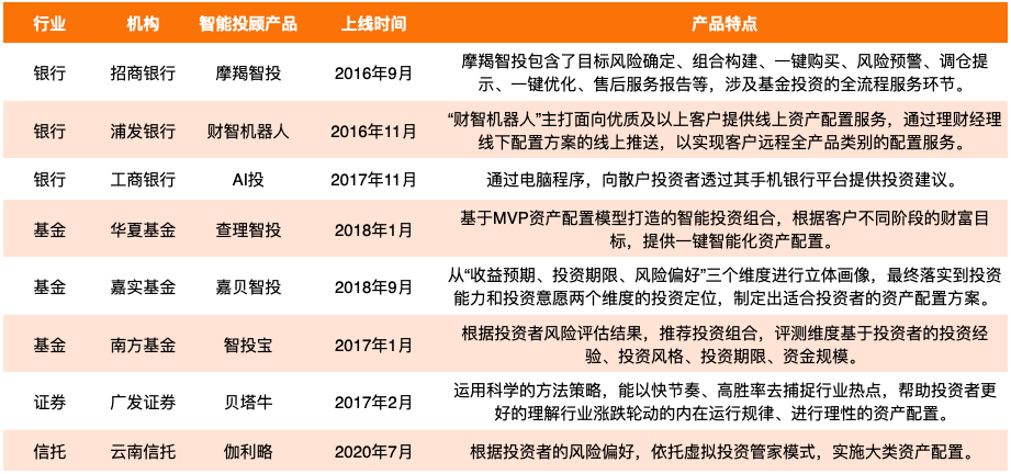3、银行、基金、证券等传统金融机构智能投顾产品较为丰富。