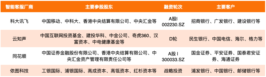3、智能客服厂商:科大讯飞、同花顺A股上市,云知声、依图分别获得多轮融资