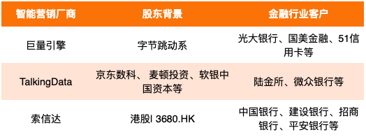 目前服务金融行业的头部智能营销厂商有:字节跳动所属的巨量引擎、软银投资的TalkingData、港股上市企业索信达等。