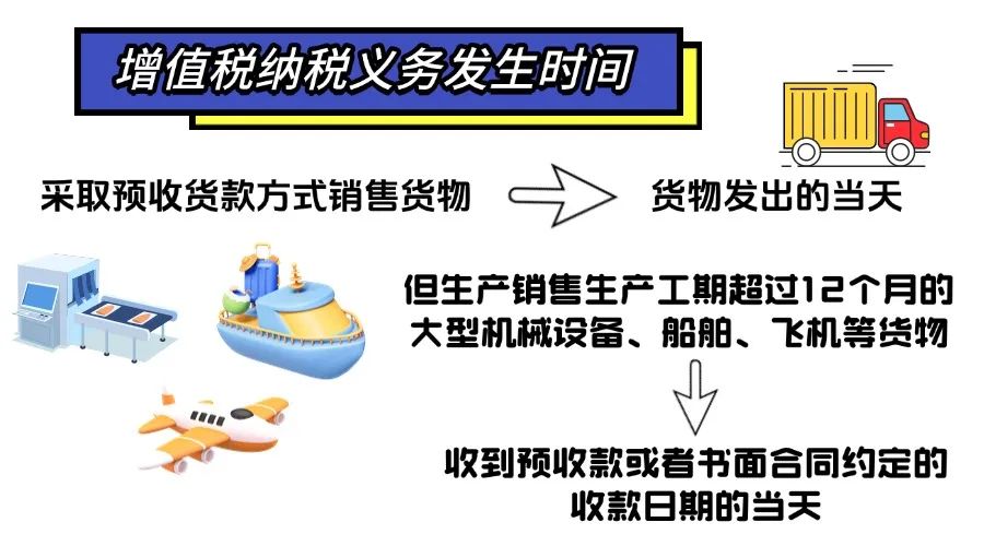 采取预收货款方式销售货物,增值税纳税义务发生时间为货物发出的当天,但生产销售生产工期超过12个月的大型机械设备、船舶、飞机等货物,为收到预收款或者书面合同约定的收款日期的当天。
