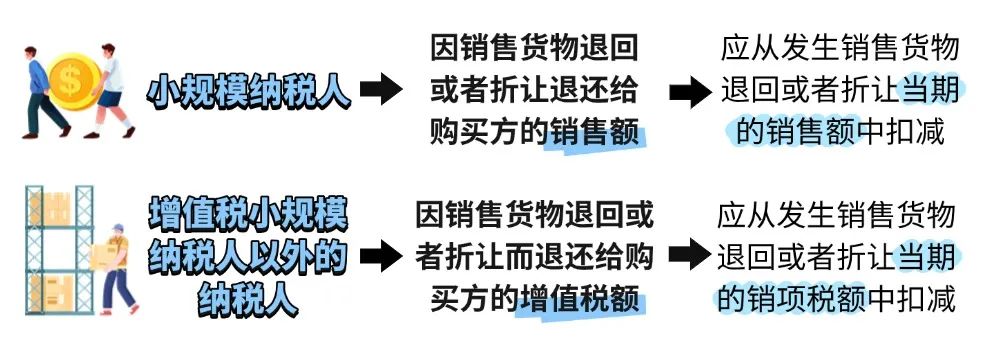 《增值税暂行条例实施细则》第三十一条规定,小规模纳税人因销售货物退回或者折让退还给购买方的销售额,应从发生销售货物退回或者折让当期的销售额中扣减。