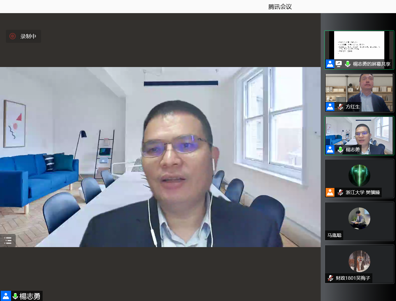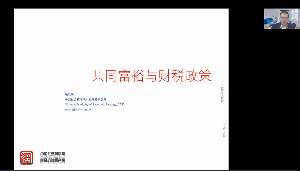 20211128日下午,中国社会科学院财经战略研究院副院长、中国社会科学院财政税收研究中心主任、中国社会科学院大学杨志勇教授应方红生副院长之邀,通过腾讯会议在“浙大经院财税大讲堂”上作了第43期讲座,主题为“共同富裕与财税政策”。浙江省财政厅陈优芳主任,浙江大学经济学院财政学系周夏飞副教授、康笛副教授、李培百人计划研究员、樊骥暕老师以及部分硕博研究生、本科生等近90人参加了讲座。