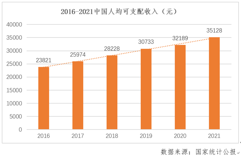 随着国家经济的飞速发展,GDP的快速增长,全国居民人均可支配收入也在同步增加,2021年全国居民人均可支配收入达到35128元,比上年名义增长9.1%。同时截至2021年末,全国基本养老保险覆盖超10亿人,基本医疗保险覆盖超13亿人。