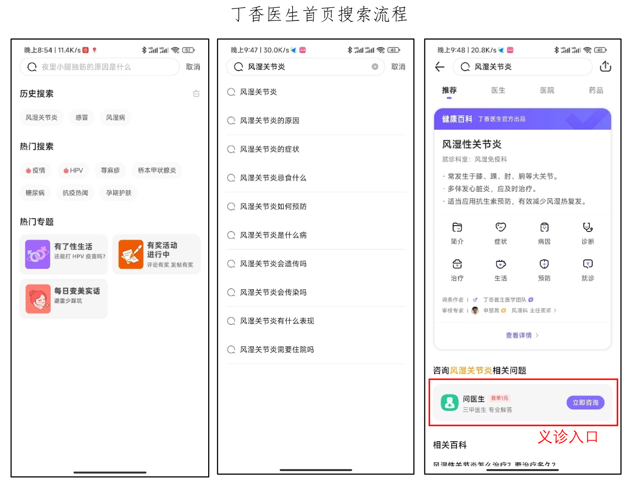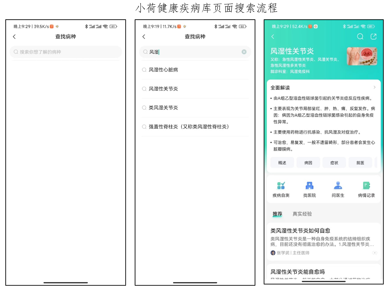 丁香医生首页和健康百科页面有搜索框,点击健康百科页面中的查疾病、查药品和查医院等功能也会出现搜索框,值得一提的是,五个搜索框本质是一致的,所以在这里只列出一种流程: