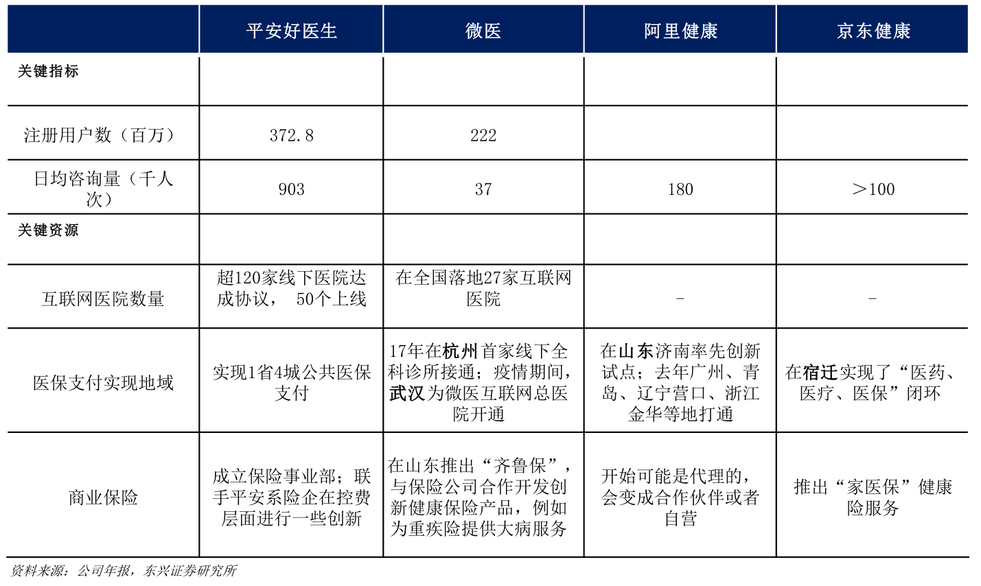 竞争态势方面,平安好医生(平安健康)和微医是在线问诊方面的龙头,阿里健康和京东健康是医药电商领域的霸主。