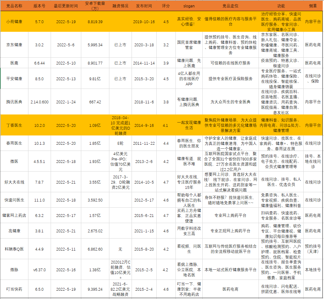 三、 竞品分析 1. 确定竞品在应用市场及搜索引擎搜索“互联网医疗APP”、“在线问诊”等关键词,共发现15个面向C端的较为知名的移动医疗APP,通过对比该类APP的基础数据与侧重点,最终选取丁香医生作为本次小荷健康竞品分析的对象。原因有二: