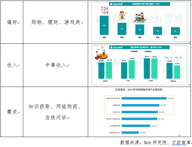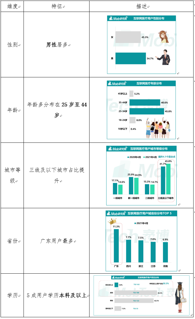从用户研究来看,互联网医疗行业的86%用户集中在22-44岁,男性为主,主要分布在东南沿海等经济发达地区,本科及以上学历用户占比50.3%。该类用户喜欢购物、理财和游戏,登录互联网医疗平台的目的是为了获取知识、网络购药以及在线问诊。