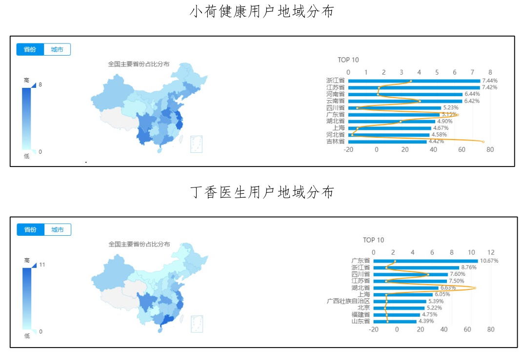 从使用区域上看,小荷健康的用户主要在浙江、江苏、河南、云南;丁香医生的用户主要在广东、浙江、四川和江苏,用户分布差异较大的原因可能是投放的策略不同,不过浙江和江苏是两个重叠市场。