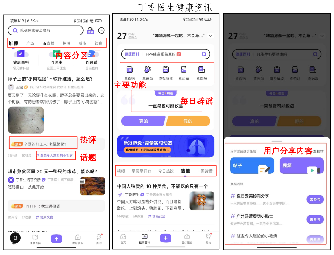 运营内容:每日辟谣(答题排行榜)、签到领丁香豆、广场功能(个人可以发帖,不用经过同行评议)、热评、今日热议、早买早开心(软广告)、一图读懂、话题等。