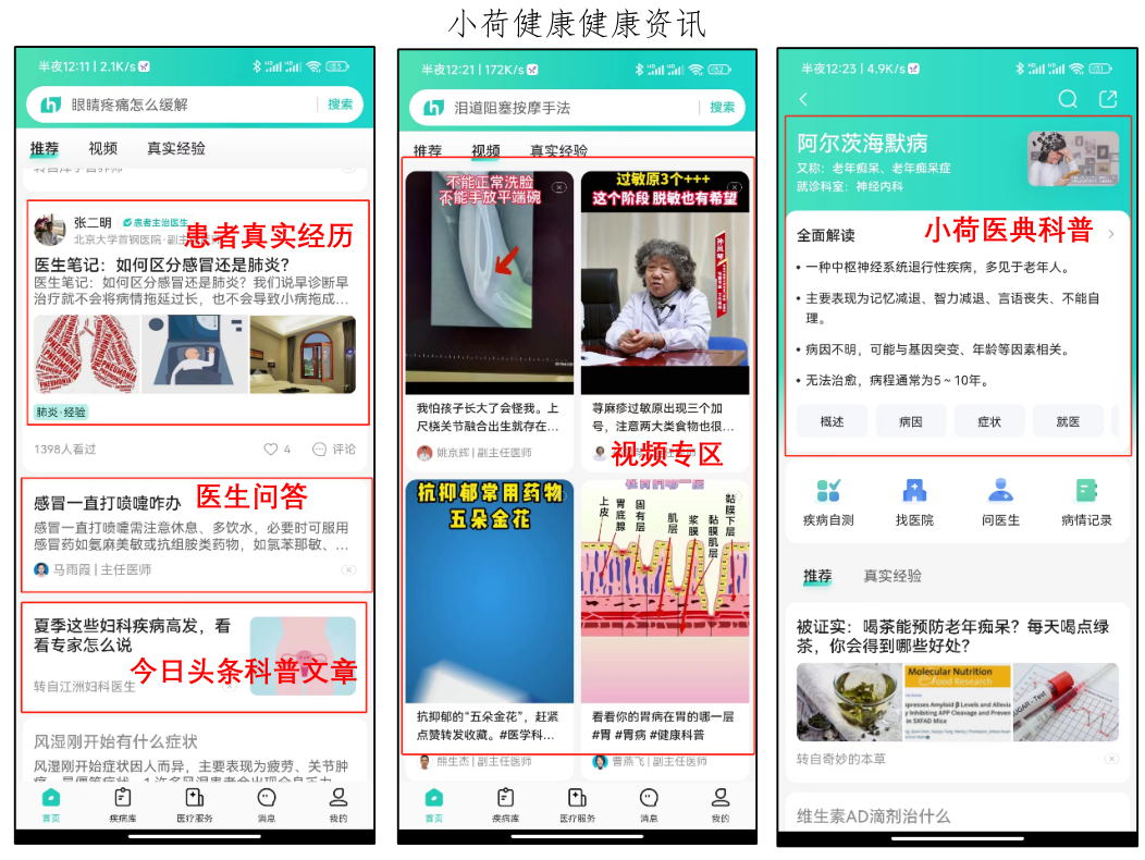 医疗内容:主要包括疾病库、真实经验(患者分享或者主治医师分享)、医生问答和转载今日头条的文章。