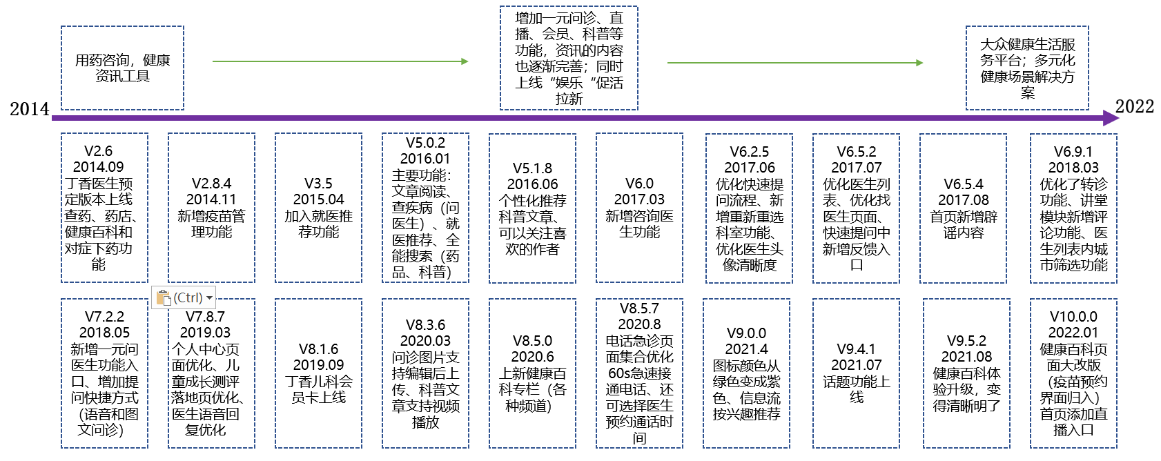 丁香医生APP于2014年上线,定位为用药咨询和健康资讯,一开始的功能只有查药品、对症下药、健康百科和查药店;后来又增加了查疾病、向医生提问,健康资讯内容也不断的优化和扩充。