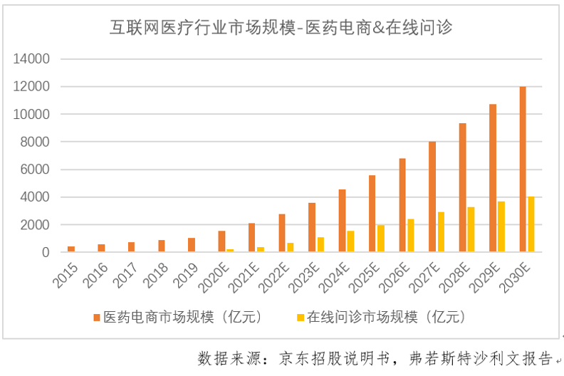 互联网医疗行业有众多细分市场,医药电商和在线问诊占据了大部分市场。2020年,医药电商和在线问诊预计市场规模分别是1570亿元和22亿元。随着互联网行业的发展和科技进步的赋能,中国医药电商和在线问诊的市场规模将进入高速增长阶段,预计2030年医药电商和在线问诊将分别达到1.2万亿和4070亿元。