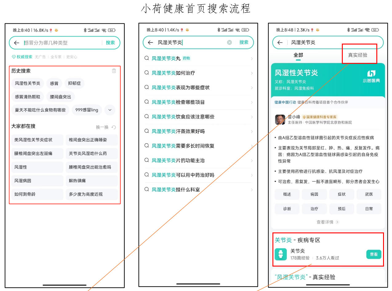 首页搜索流程:首页选中搜索框后进入搜索页面,可以看到历史搜索和大家都在搜,输入关键词后会显示联想词,搜索结果包括全部、真实经验。全部界面中有疾病专区,点击“查看”便可以跳转至疾病专区,里面有问医生、找医院等功能入口(见下图)
