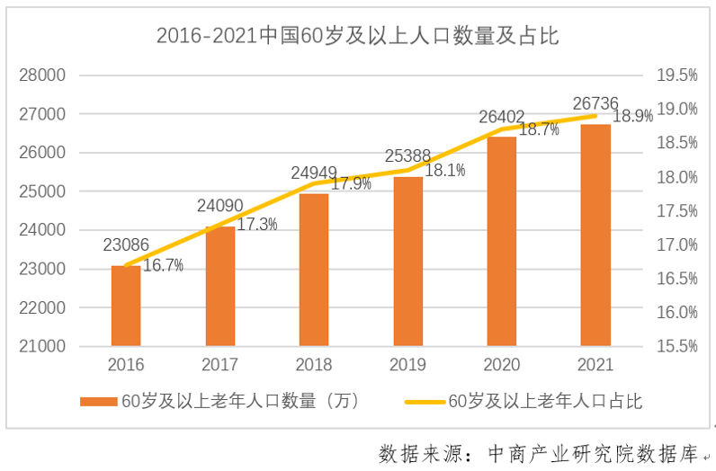 人口老龄化程度持续加深。中商产业研究院数据显示,2021年中国60岁及以上人口数量达2.67亿,人口老龄化率达到18.9%,且这一数据呈现逐年上升的趋势。