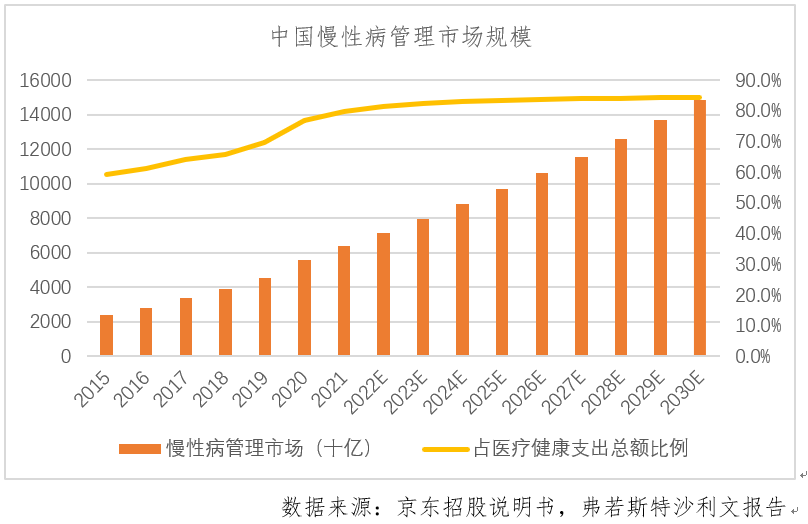慢性病市场持续扩容。从市场规模看,慢性病支出一直占我国医疗健康总支出的很大一部分,根据沙利文的数据,2021年我国慢性病管理市场规模预计达6.3万亿,占医疗健康支出总额近80%。