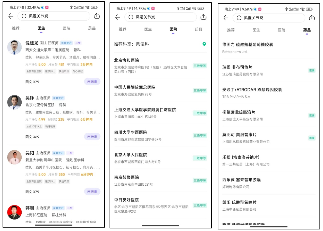 健康内容:健康百科(疾病库、药品库、查医院、体检解读等)、健康日历、医生发布的患者经历、生活健康内容(护肤、减脂、饮食等)、话题内容(可能和健康无关),内容涵盖范围广,有的内容质量不高、且真假难辨。