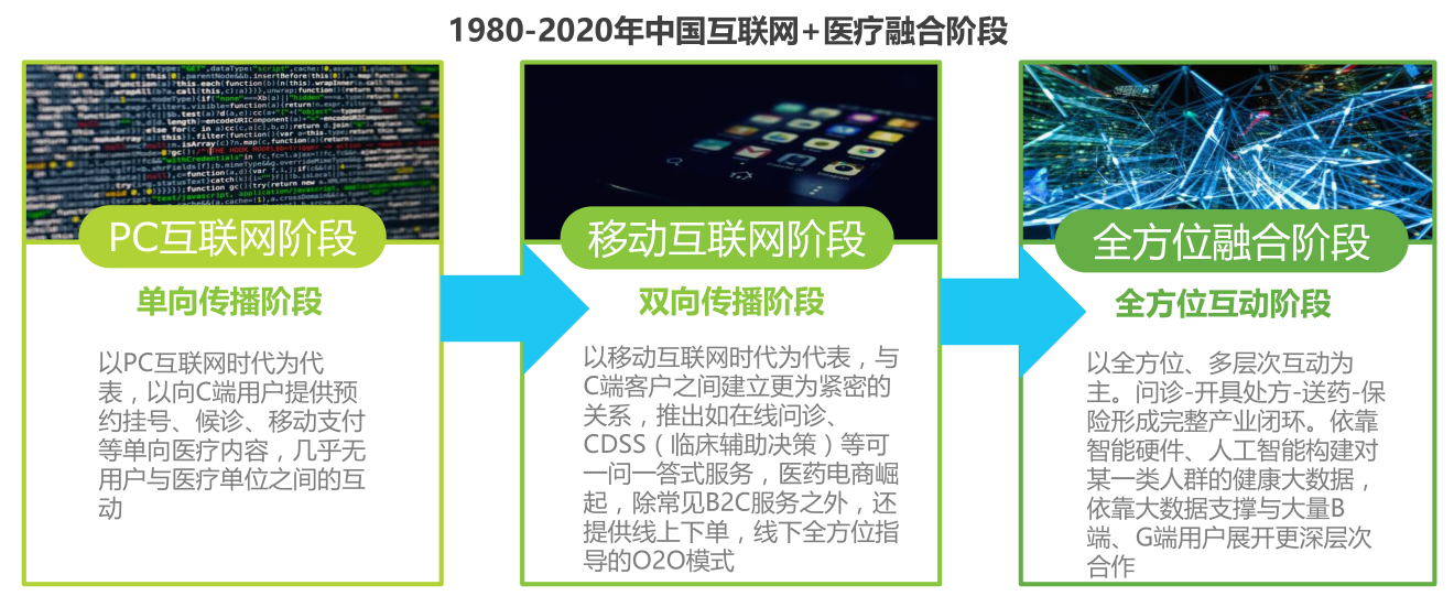 互联网医疗与互联网本身的发展密切相关。总体而言,我国互联网+医疗已走过以PC互联网为主的1.0时代和以移动互联网为主的2.0时代,目前处于2.0至3.0阶段的过渡时期,即将走向以互联网医院为转型方向的3.0阶段。最终3.0阶段将会实现全面的互联网医院,囊括在线问诊、诊断、远程治疗、处方开具、送药到家等服务内容。