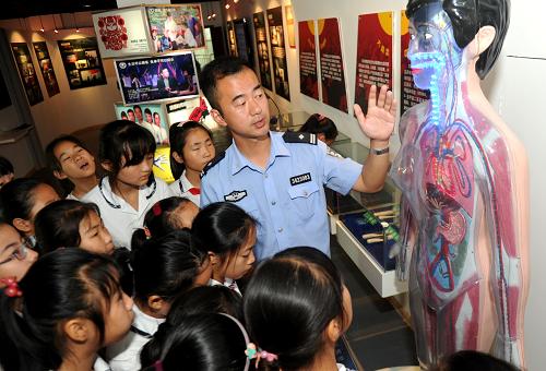 6月26日,在安徽省戒毒康复中心禁毒教育展览室,警官胡炜站在人体模型旁向学生们介绍不同毒品对人体不同部位的危害。当日是国际禁毒日,安徽合肥朝霞小学组织小学生走进安徽省戒毒康复中心,开展禁毒宣传活动,教育孩子们从小远离毒品。新华社记者 刘军喜 摄