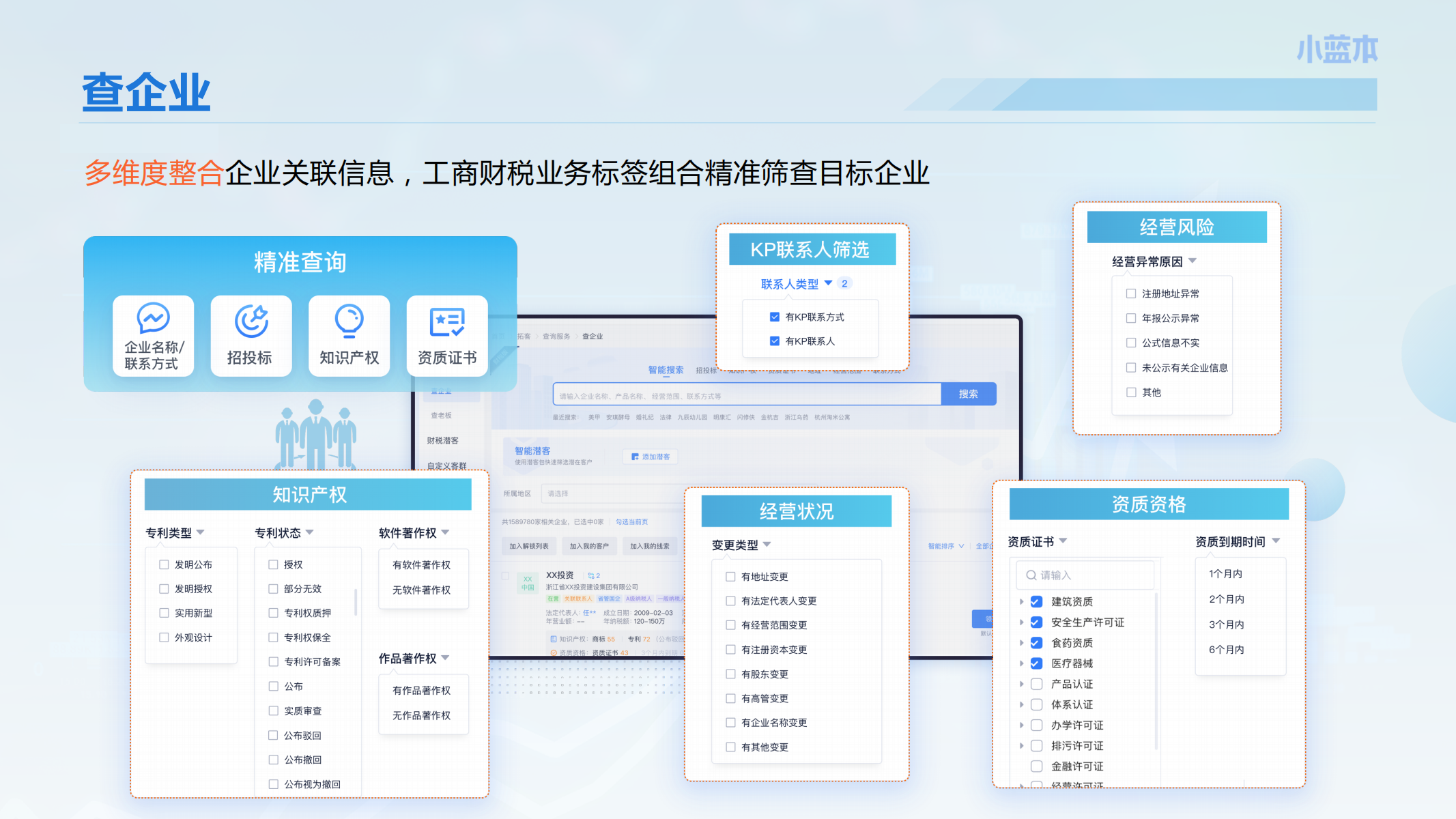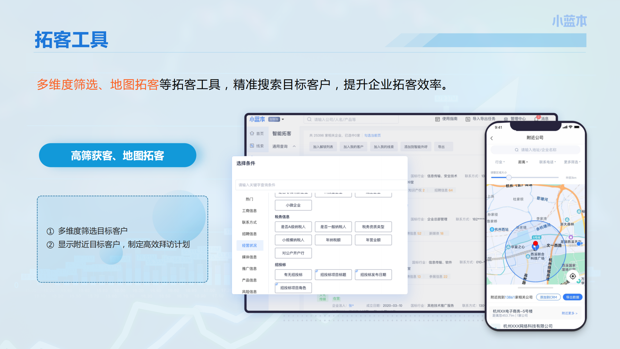 三、大数据获客系统现在有很多基于AI+大数据,结合财税服务业务场景提供多重筛选纬度的大数据获客系统。小蓝本获客系统是一款专为财税服务行业设计的大数据获客工具,它利用AI+大数据技术帮助企业实现数字化营销转型。这个系统提供了超过10000个数据维度的选择,允许用户根据具体需求组合使用不同的筛选条件,从而获取海量的潜在客户线索。这意味着无论是寻找特定地区的小微企业还是全国范围内的大型企业集团,都能够快速定位到最合适的对象。这样销售团队可以直接接触到财税行业的目标群体,从而减少无效沟通的时间,集中资源于高价值的对话上。