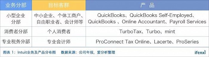 小型企业分部,主要客群为小微企业、自雇人士以及为他们提供服务的专业会计人员,核心产品为QuickBooks,为客户提供基于财务和税务管理的云端和桌面软件服务,除此之外,还提供薪资管理解决方案和支付处理解决方案。