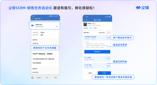 现在,您可以在尘锋SCRM的帮助下,更系统地完成销售指导:您可以基于您的行业经验和销冠实践,总结出一套可复用的客户跟进策略,并通过尘锋SCRM为销售设置阶段性任务,尘锋SCRM将基于您的跟进策略,自动提醒销售去联系客户,确保意向客户没有遗漏都能被及时跟进,提高销售团队转化效率。