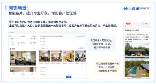 在客户建联场景,企业也可以通过尘锋SCRM提效客户沟通,比如通过尘锋的智能名片帮助销售打造专业形象,并提供丰富的案例及介绍资料,客户可以通过访问智能名片页面了解企业业务和产品特点,并建立良好的第一印象,为后续沟通转化奠定良好基础。