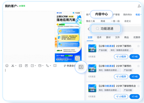 在日常和客户沟通场景,企业可以通过尘锋SCRM的内容中心为销售提供丰富的跟进资料,比如基础的产品介绍、公司介绍、客户案例,以及能够吸引客户兴趣、建立专业形象的行业干货文章/报告,以及针对重要业务问题的有效话术,辅助销售做好客户沟通。