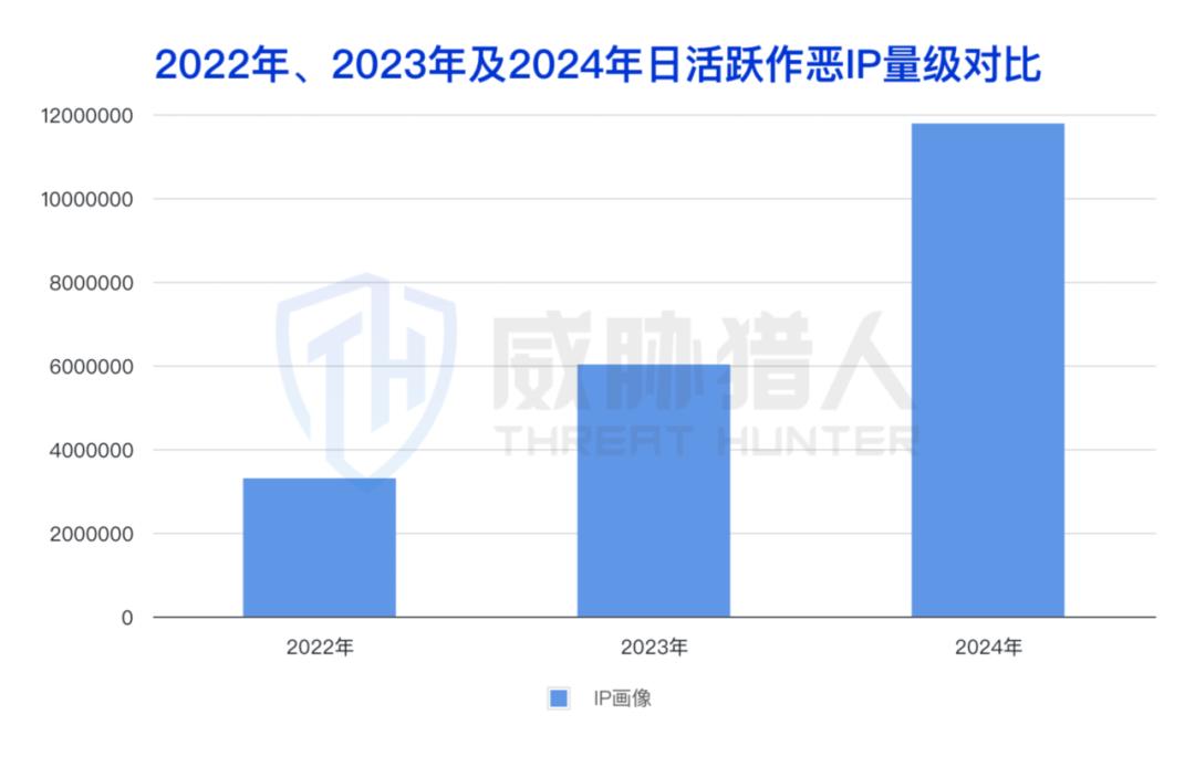 2024年,威胁猎人加强对海外作恶IP进行的监测,2024年共捕获海外作恶IP4479万个,相比2023年提升了102.14%。