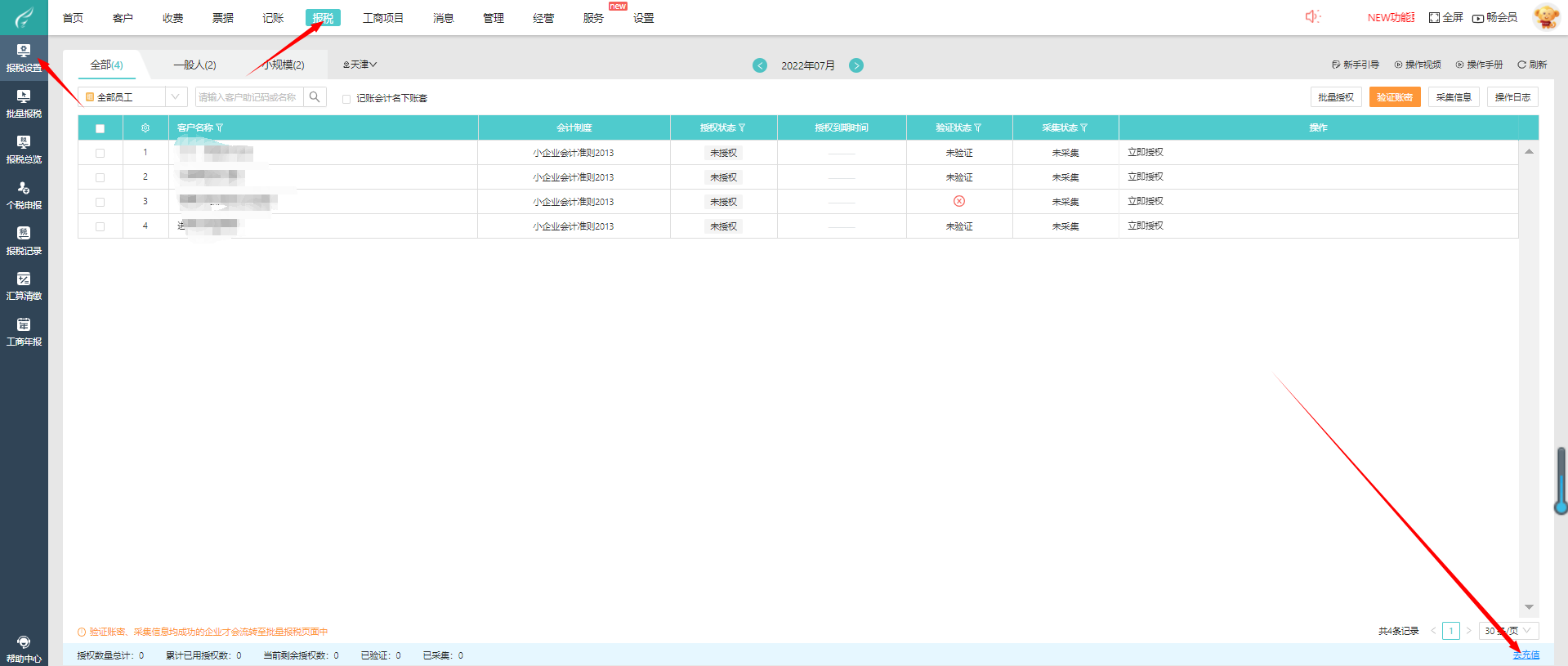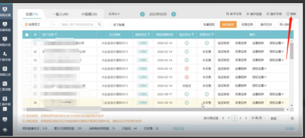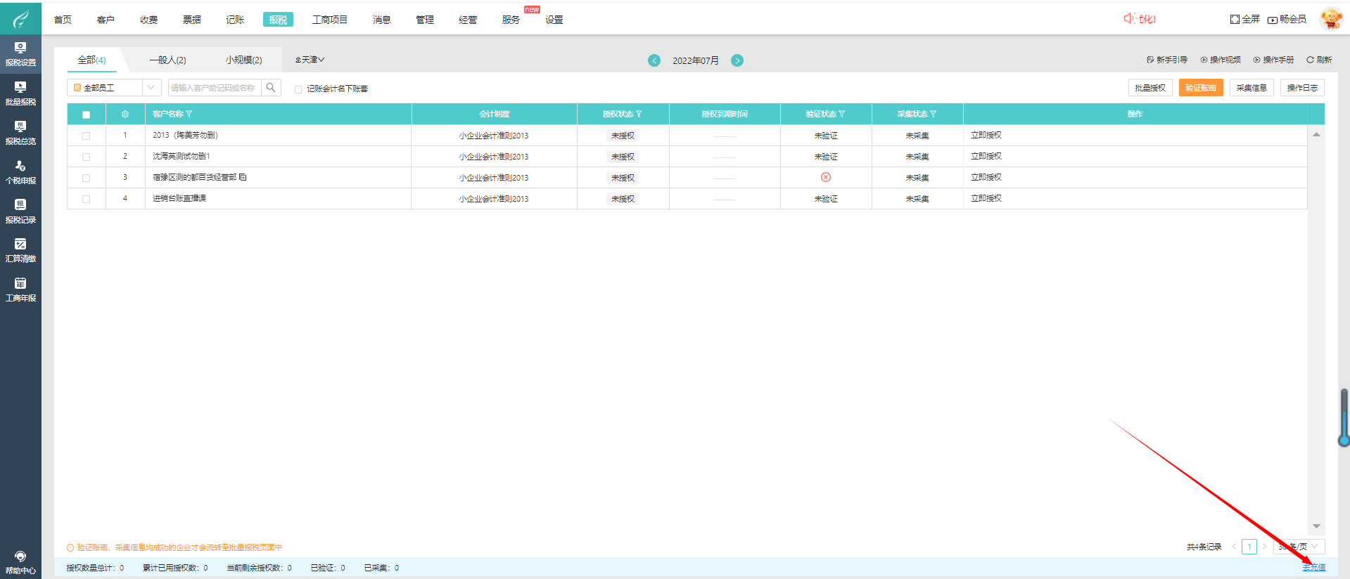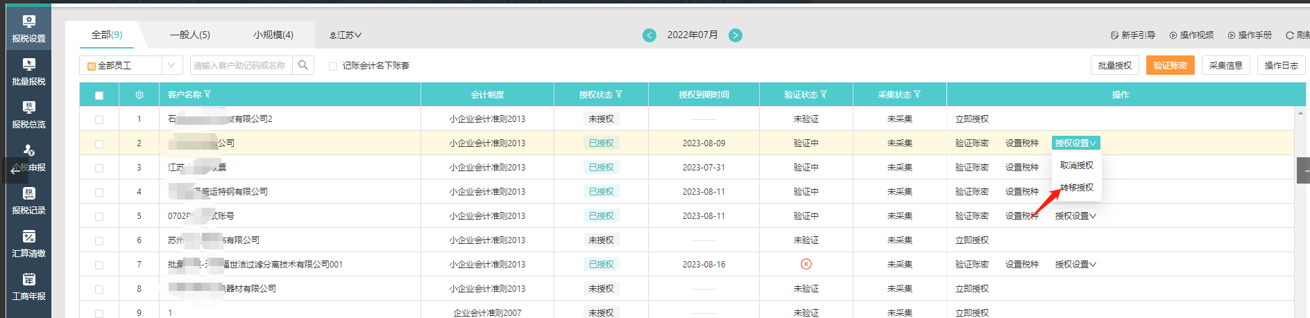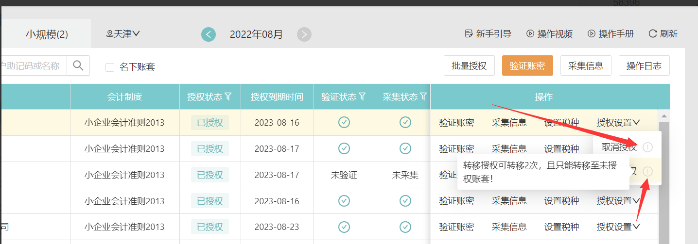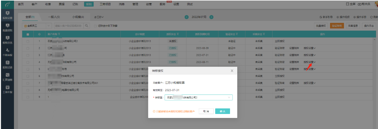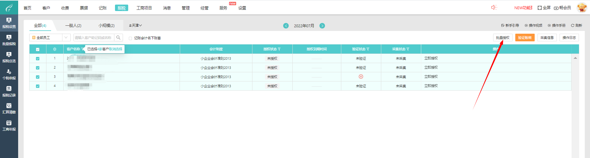 在【客户】页面,勾选账套,点击页面右上方的【批量授权】。(需要先充值才能进行授权)