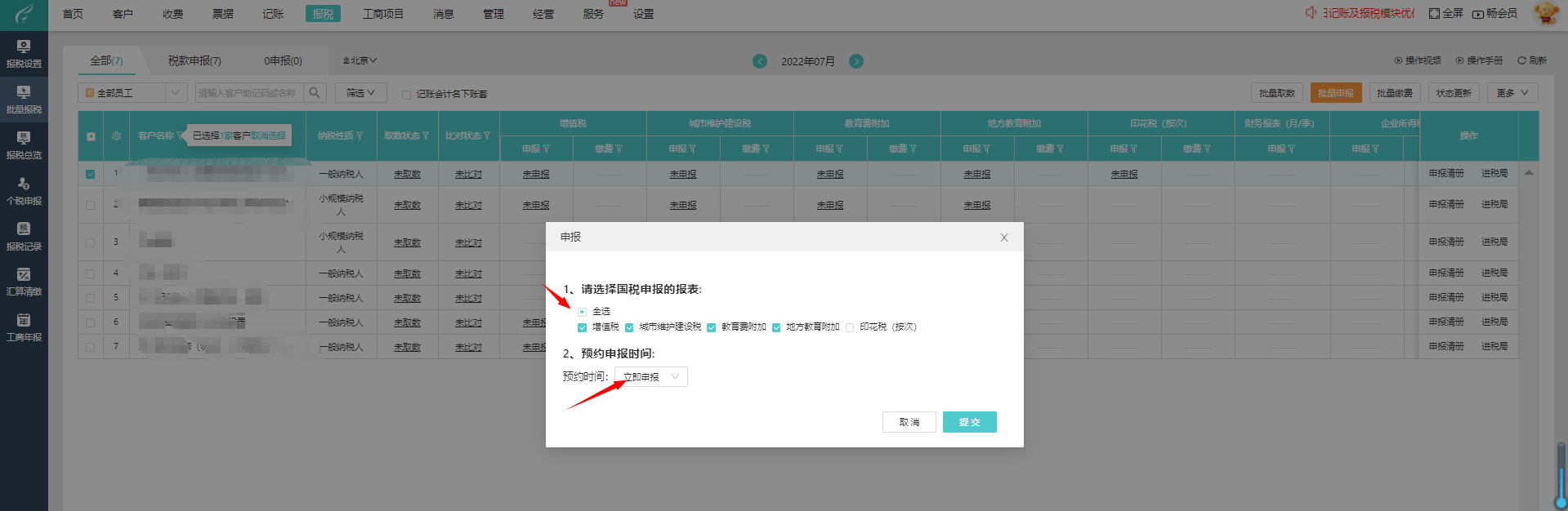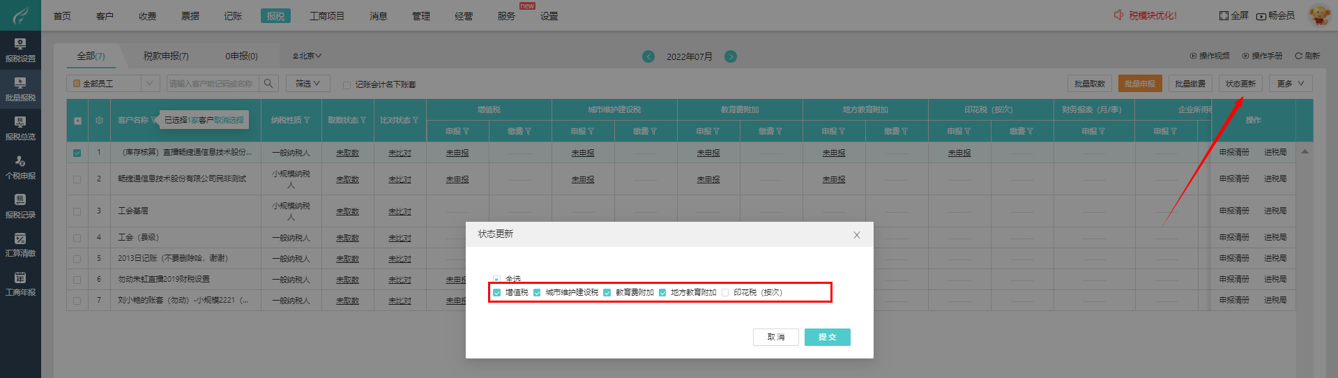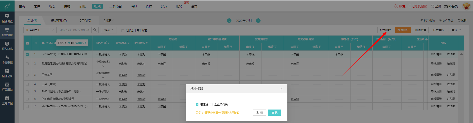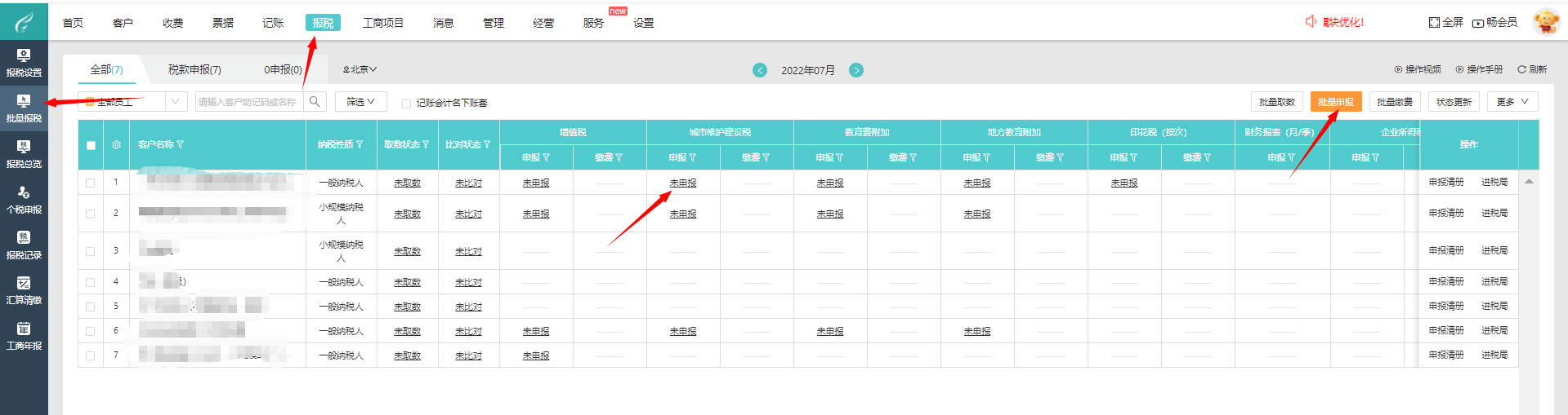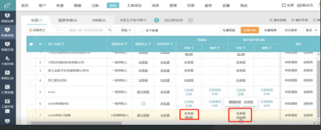 勾选需要申报的客户,点击“批量申报”或点击单个客户操作中的“申报“或直接点击对应税种”未填写或未申报“均可以进入申报流程。